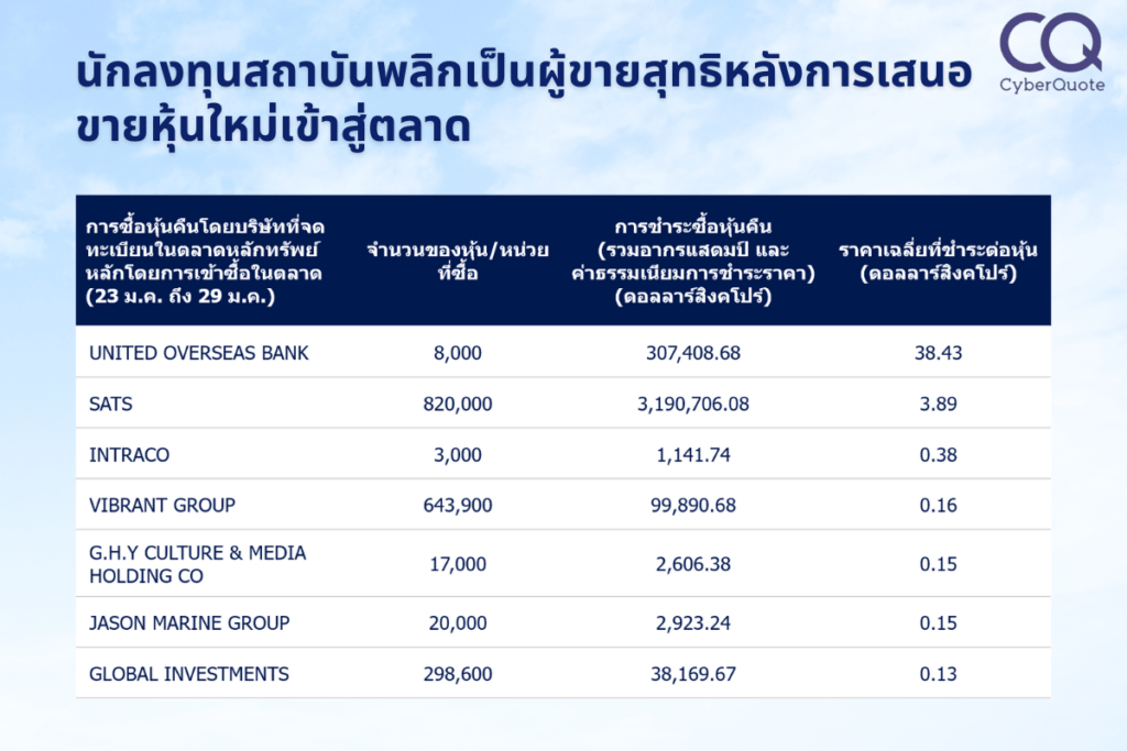 ในขณะเดียวกัน United Overseas Bank, CapitaLand Investment, Singtel, Wilmar International, iFAST Corporation, CNMC Goldmine Holdings, Keppel, Hongkong Land Holdings, Singapore Exchange และ UOB‑Kay Hian Holdings ขึ้นนำในส่วนการเข้าซื้อสุทธิจากนักลงทุนสถาบัน ส่วน Oversea‑Chinese Banking Corp, CapitaLand Investment, United Overseas Bank, Hongkong Land Holdings, and UOL Group have ขึ้นนำการเข้าซื้อสุทธิจากนักลงทุนสถาบันสำหรับเดือนนี้จนถึงเวลาปิดตลาดของวันที่ 29 มกราคม