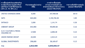 มีการยื่นรายงานการเข้าซื้อหุ้นโดยประธานเจ้าหน้าที่บริหารหรือกรรมการของบริษัท Duty Free International, HG Metal Manufacturing, JEP Holdings, PSC Corporation และ Mermaid Maritime Public Company ขณะที่มีการยื่นรายงานการขายหุ้นสำหรับ ACMA, Raffles Education และ Reclaims Global