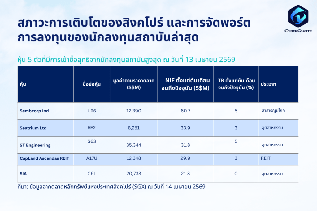 ที่มา: ข้อมูลจากตลาดหลักทรัพย์แห่งประเทศสิงคโปร์ (SGX) ณ วันที่ 14 เมษายน 2569