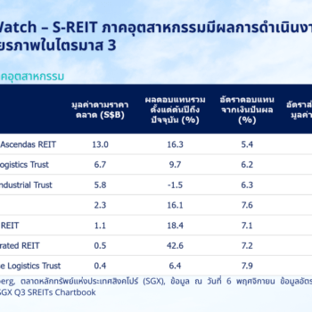 S-REIT ภาคอุตสาหกรรม ที่มา: Bloomberg, ตลาดหลักทรัพย์แห่งประเทศสิงคโปร์ (SGX), ข้อมูล ณ วันที่ 6 พฤศจิกายน ข้อมูลอัตราตอบแทนจากเงินปันผลจาก SGX Q3 SREITs Chartbook กองทรัสต์เพื่อการลงทุนในอสังหาริมทรัพย์ของสิงคโปร์ (S-REIT) สำหรับทรัพย์สินภาคอุตสาหกรรมมีผลการดำเนินงานที่มีเสถียรภาพในไตรมาสที่สามที่สิ้นสุดเดือนกันยายน เนื่องจากอัตราการเช่ายังคงที่โดยมีการปรับขึ้นค่าเช่าของทรัพย์สินในพอร์ตโฟลิโอ S-REIT เจ็ดกองที่เน้นการลงทุนในทรัพย์สินภาคอุตสาหกรรม ได้แก่ Alpha Integrated REIT (เดิมชื่อ Sabana Industrial REIT), Mapletree Logistics Trust, Mapletree Industrial Trust, ESR REIT, CapitaLand Ascendas REIT, AIMS APAC REIT และ Daiwa House Logistics Trust ทรัสต์หกจากเจ็ดกองได้รายงานอัปเดตรายไตรมาสล่าสุดแล้ว และส่วนใหญ่มีการจ่ายผลตอบแทนมากขึ้นในไตรมาสล่าสุด Alpha Integrated REIT ซึ่งรายงานผลประกอบการของกองฯ…