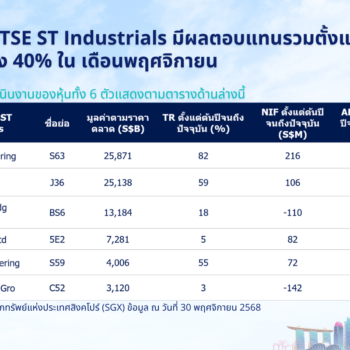 ดัชนี FTSE ST Industrials สร้างผลตอบแทนรวม 36% ในช่วง 11 เดือนแรกของปี 2568 ที่ระดับ 915.2 โดยเงินปันผลช่วยหนุนผลตอบแทนรวมให้เพิ่มขึ้นเป็น 7% การปรับเพิ่มราคาเป้าหมายของหุ้นต่าง ๆ ในดัชนีช่วยผลักดันราคาเป้าหมายของดัชนีให้เพิ่มขึ้น 33% ในปีนี้ จาก 777.9 เป็น 1,031.9 Hong Leong Asia ทำผลตอบแทนสูงสุดในดัชนีโดยมีผลตอบแทน 141% จากการเข้าซื้อจำนวน 53 ล้านดอลลาร์สิงคโปร์ เนื่องจากกิจการร่วมค้าของ China Yuchai ได้เปิดตัวเครื่องยนต์ MTU Series 2000 ในเดือนสิงหาคม นอกจากนี้ มูลค่าการซื้อขายเฉลี่ยต่อวัน (ADT) ก็เพิ่มขึ้นจาก 1 ล้านดอลลาร์สิงคโปร์ในช่วงครึ่งแรกของปี 2568 เป็น 4.1 ล้านดอลลาร์สิงคโปร์ในช่วงครึ่งปีหลัง โดยนักวิเคราะห์ยังได้ปรับเพิ่มราคาเป้าหมายของหุ้นดังกล่าวด้วย ในกลุ่มหุ้นอุตสาหกรรมขนาดเล็กและกลาง (SMID Industrials)…