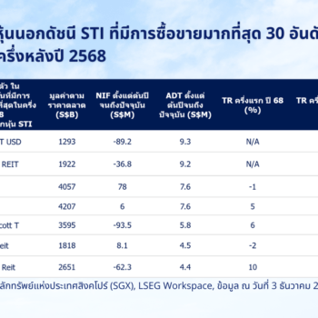 นอกเหนือจากหุ้น 30 ตัวในดัชนี Straits Times (STI) แล้ว หุ้นที่มีมูลค่าการซื้อขายรายวันสูงที่สุดถัดมาอีก 30 ตัวในช่วงครึ่งหลังปี 2568 ครอบคลุมทั้ง 12 กลุ่มภาคธุรกิจ และมีมูลค่าตามราคาตลาดรวมถึง 74 พันล้านดอลลาร์สิงคโปร์ หุ้นทั้ง 30 ตัวนี้ประกอบด้วยหุ้นใหม่ 3 ตัว ได้แก่ YZJ Maritime, NTT DC REIT และ CAREIT ซึ่งมีผลตอบแทนรวมตั้งแต่จดทะเบียนเข้าตลาดหลักทรัพย์ในช่วงตั้งแต่ 17% สำหรับ CAREIT ไปจนถึง -3% สำหรับ NTT DC REIT หุ้น 27 ตัวจาก 30 ตัว ที่จดทะเบียนในช่วงครึ่งปีแรกของปี 2568 มีมูลค่าการซื้อขายเฉลี่ยต่อวัน (ADT) เพิ่มขึ้นจาก 115 ล้านดอลลาร์สิงคโปร์ในครึ่งแรกของปี 2568 เป็น…