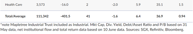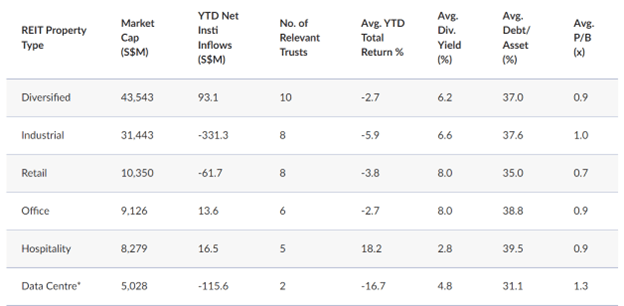 สําหรับทรัสต์หลักสี่แห่งที่มีทรัพย์สินของสิงคโปร์ ดังตารางด้านล่าง ศูนย์ข้อมูลและ REITs อุตสาหกรรมต่างจากปีที่ผ่านมาเป็นกลุ่มที่มีประสิทธิภาพน้อยที่สุดของภาค S-REITในขณะที่ส่วนงานบริการประกอบด้วยทรัสต์หลักห้าแห่งเป็นส่วนที่มีประสิทธิภาพสูงสุด