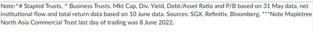 Far East Hospitality Trust, Ascott Residence Trust และ CDL Hospitality Trusts นอกเหนือจาก Diversified REIT, Suntec REIT ยังติดอันดับหนึ่งใน 20 REIT ที่แข็งแกร่งที่สุดในเอเชียแปซิฟิกในปี 2022 จนถึงวันที่ 10 มิถุนายน CapitaLand Integrated Commercial Trust ดังกล่าวเป็น S-REIT ที่มีประสิทธิภาพสูงสุดอันดับถัดไป โดยมีผลตอบแทนรวม 9.0% ไม่รวม Mapletree North Asia Commercial Trust ซึ่งมีการซื้อขายวันสุดท้ายในวันที่ 8 มิถุนายน