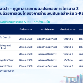 REIT Watch – ฤดูกาลรายงานผลประกอบการไตรมาส 3 เริ่มต้นขึ้นด้วยการเติบโตของการจ่ายเงินปันผลสำหรับ S-REIT