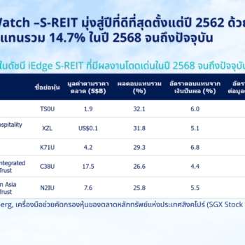 กองทรัสต์ในดัชนี iEdge S-REIT ที่มีผลงานโดดเด่นในปี 2568 จนถึงปัจจุบัน ที่มา: Bloomberg, เครื่องมือช่วยคัดกรองหุ้นของตลาดหลักทรัพย์แห่งประเทศสิงคโปร์ (SGX Stock Screener) กองทรัสต์เพื่อการลงทุนในอสังหาริมทรัพย์ของสิงคโปร์ (S-REIT) มีแนวโน้มจะสร้างผลการดำเนินงานงานรายปีที่ดีที่สุดตั้งแต่ปี 2562 เนื่องจากราคาฟื้นตัวขึ้นท่ามกลางการดำเนินงานที่มีเสถียรภาพ และสภาพแวดล้อมทางอัตราดอกเบี้ยที่เอื้อประโยชน์มากขึ้น ณ วันที่ 5 ธันวาคม 2568 ดัชนี iEdge S-REIT ได้ปรับตัวขึ้น 9.3% นับตั้งแต่ต้นปีจนถึงปัจจุบัน โดยเมื่อรวมการจ่ายเงินปันผลแล้วทำให้ผลตอบแทนรวมเพิ่มขึ้นเป็น 14.7% ซึ่งถือเป็นผลงานรายปีที่แข็งแกร่งที่สุดนับตั้งแต่ปี 2562 ซึ่งในขณะนั้นดัชนีปรับขึ้น 19.6% และมีผลตอบแทนรวม 27.5% ในบรรดาหุ้น 33 ตัวในดัชนี iEdge S-REIT มีหุ้น 29 ตัวที่ให้ผลตอบแทนรวมเป็นบวกในปี 2568 จนถึงปัจจุบัน โดยหุ้นที่มีผลการดำเนินงานดีที่สุด 10 อันดับแรกมีผลตอบแทนรวมมากกว่า 20% หุ้นที่มีผลการดำเนินงานโดดเด่น รวมถึง S-REIT ที่ลงทุนในทรัพย์สินหลากหลายประเภท…