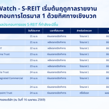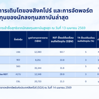 เศรษฐกิจของสิงคโปร์ยังคงมีความแข็งแกร่งในไตรมาส 1 ปี 2569 โดยมีการเติบโต 6% เมื่อเทียบกับปีก่อนหน้า แม้ว่าการเติบโตเมื่อเทียบกับไตรมาสก่อนหน้าจะชะลอตัวลงจากแรงกดดันด้านต้นทุนนำเข้าที่เพิ่มขึ้น ซึ่งสอดคล้องกับการที่ภาคธุรกิจให้ความสำคัญมากขึ้นกับการรักษาอัตรากำไร การบริหารสินค้าคงคลัง และความยืดหยุ่นในการดำเนินงาน ท่ามกลางสภาพแวดล้อมภายนอกที่มีความเสี่ยงสูงขึ้น การเข้าซื้อสุทธิในหุ้นสิงคโปร์ของนักลงทุนสถาบันในเดือนเมษายนนำโดยกลุ่มอุตสาหกรรม เทคโนโลยี และสาธารณูปโภค โดยการเข้าซื้อสุทธิในกลุ่มเทคโนโลยีกระจุกตัวอยู่ในหุ้นที่เกี่ยวข้องกับการผลิตและการทดสอบ รวมถึง iFAST ด้วย ขณะที่การเข้าซื้อในกลุ่ม S-REIT อยู่ในระดับค่อนข้างจำกัด ส่วนกลุ่มบริการทางการเงินและโทรคมนาคมมีการขายออกสุทธิ Sembcorp Industries ขึ้นนำหุ้นที่มีการเข้าซื้อสุทธิจากนักลงทุนสถาบันในเดือนเมษายน ขณะที่ Oiltek International มีการปรับตัวขึ้นของราคาหุ้นสูงที่สุดในบรรดา 30 หุ้นที่มีการเข้าซื้อสุทธิจากนักลงทุนสถาบันสูงสุดในช่วงเวลาดังกล่าว ทั้งนี้ ความเคลื่อนไหวของราคาและการเข้าซื้อจากนักลงทุนสถาบันสอดคล้องกับการเลือกลงทุนแบบคัดเลือกภายในตลาดหุ้นสิงคโปร์ สิงคโปร์: ความแข็งแกร่งของเศรษฐกิจมหภาคในสภาพแวดล้อมโลกที่มีความเสี่ยงสูงขึ้น รายงาน GDP ไตรมาส 1 ปี 2569 เบื้องต้นระบุว่า เศรษฐกิจสิงคโปร์ยังคงมีความแข็งแกร่งเมื่อเทียบกับปีก่อน ขณะที่แรงส่งการเติบโตได้อ่อนตัวลงเมื่อเทียบกับเชิงไตรมาสก่อนท่ามกลางแรงกดดันด้านต้นทุนนำเข้าที่เพิ่มขึ้น ข้อมูลดัชนีผู้จัดการฝ่ายจัดซื้อ (PMI) ในเดือนมีนาคมชี้ให้เห็นว่าภาคธุรกิจให้ความสำคัญมากขึ้นกับการปกป้องอัตรากำไร การบริหารสินค้าคงคลัง และความยืดหยุ่นของอุปทาน เนื่องจากราคาต้นทุนและผลผลิตยังคงปรับตัวสูงขึ้น และการสะสมสินค้าในคลังก็เร่งตัวขึ้น เมื่อรวมกันแล้ว…