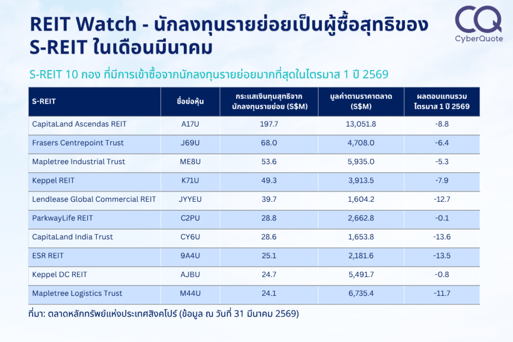 แม้ว่าผลการดำเนินงานด้านราคาจะอ่อนตัวลง แต่กิจกรรมการซื้อขายของนักลงทุนรายย่อยในภาค S-REIT กลับเพิ่มขึ้นในเดือนมีนาคม โดยนักลงทุนรายย่อยเป็นผู้ซื้อสุทธิและมีการเข้าซื้อสุทธิมากกว่า 300 ล้านดอลลาร์สิงคโปร์ตลอดทั้งเดือน สะท้อนถึงการมีส่วนร่วมที่เพิ่มขึ้นในช่วงที่ตลาดปรับตัวลง