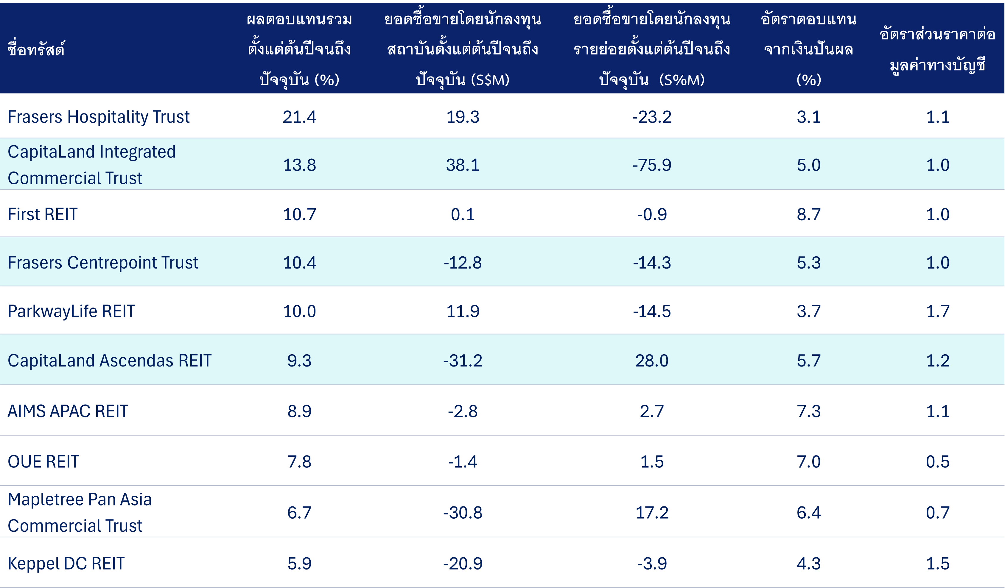ทรัสต์ที่มีผลการดำเนินงานที่โดดเด่นเหล่านี้ ได้แก่ Frasers Hospitality Trust (FHT), CapitaLand Integrated Commercial Trust (CICT), First REIT, Frasers Centrepoint Trust (FCT) และ Parkway Life REIT โดยมีผลตอบแทนรวมตั้งแต่ต้นปีจนถึงปัจจุบันอยู่ในช่วงระหว่า 10.0% และ 21.4% ณ วันที่ 26 มิถุนายน