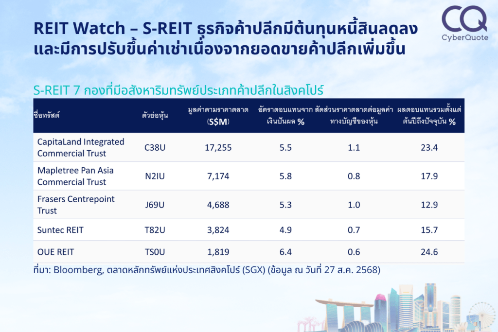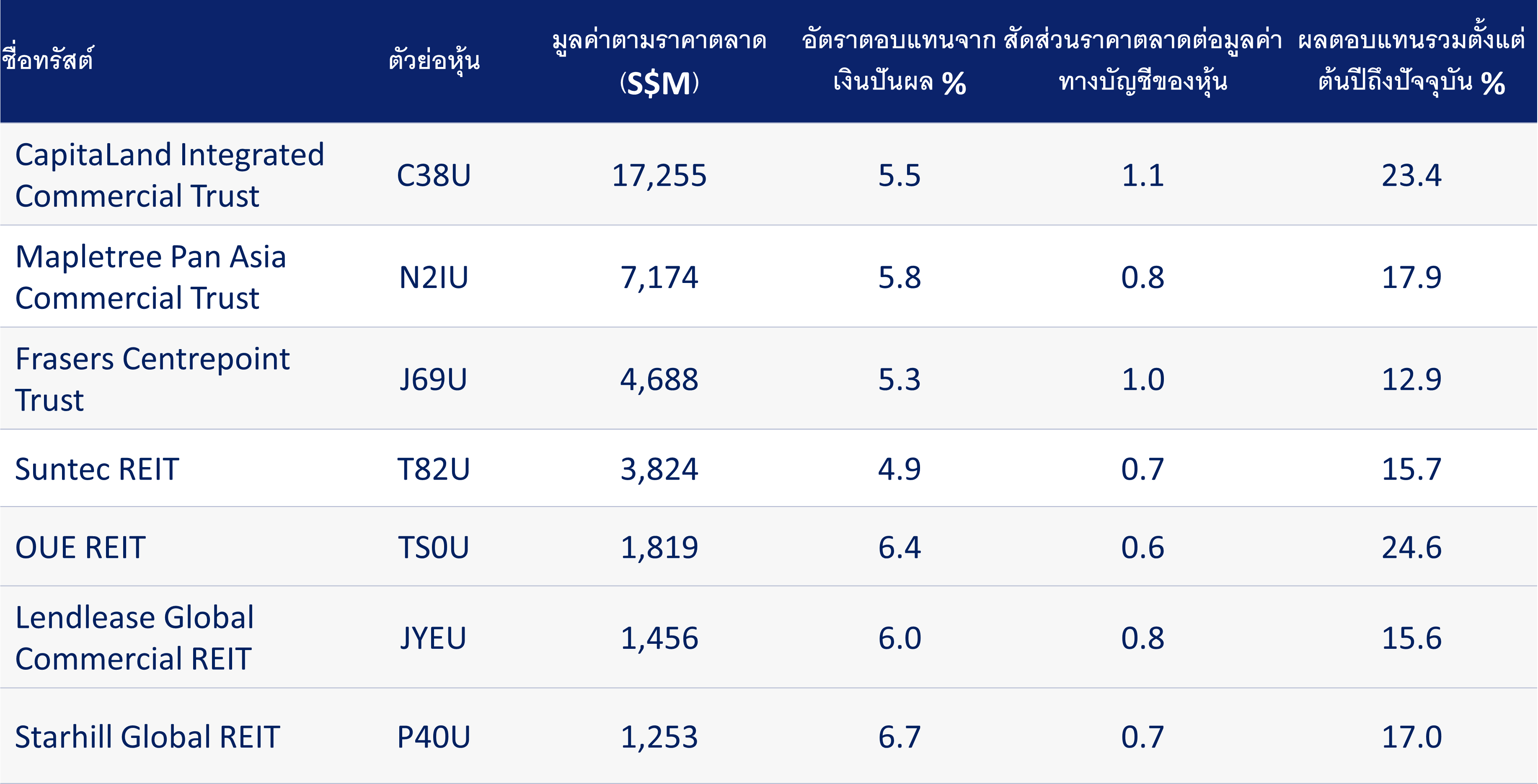 สําหรับการวิจัยและข้อมูลเพิ่มเติมเกี่ยวกับภาค REIT ของสิงคโปร์ โปรดไปที่ https://www.sgx.com/securities/sectors สําหรับแผนภูมิ SREITs & Property Trusts