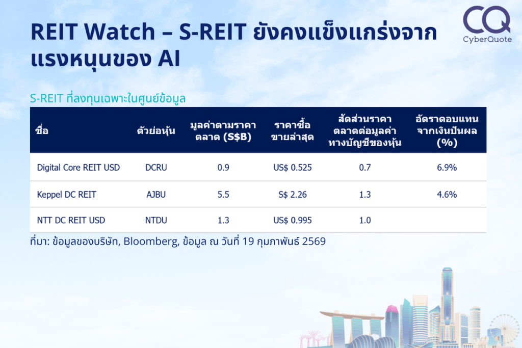 กองทรัสต์เพื่อการลงทุนในอสังหาริมทรัพย์ของสิงคโปร์ (S-REIT) ที่ลงทุนเฉพาะในศูนย์ข้อมูล (DC) มีผลการดำเนินงานที่แข็งแกร่งในผลการดำเนินงานล่าสุดสิ้นสุดที่เดือนธันวาคม โดยมีอัตราการเช่าพื้นที่ในระดับสูงและมีการปรับขึ้นค่าเช่าที่แข็งแกร่งท่ามกลางการนำเทคโนโลยี cloud และปัญญาประดิษฐ์ (AI) มาใช้งาน