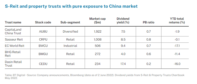 มี 5 S-Reits และทรัพย์สินที่ได้เปิดเผยสินทรัพย์อย่างแท้จริง เพื่อมอบความไว้วางใจให้แก่เหล่าผู้ลงทุน ได้แก่ Sasseur Reit, BHG Retail Reit และ Dasin Retail Trust ซึ่งเป็นทรัสต์ด้านอสังหาริมทรัพย์คือ Reits ค้าปลีก ในขณะที่ EC World Reit เป็น Reit เชิงอุตสาหกรรม และ CapitaLand China Trust เป็น Reit ที่หลากหลาย